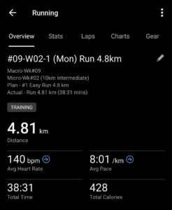 Monday’s run is known as the warm up run. A consistent 4.8km every Monday to start the week. Miles kept this run easy, with average HR at 140 bpm, though he would have preferred it to be below 140.