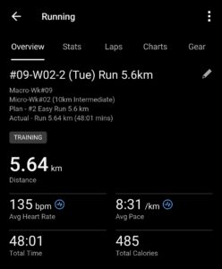 Actual: Run 5.64 km (48:01 mins)