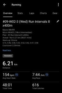 According to the website, Miles should be running the intervals at 5km race pace. But Miles was still not certain what should be his 5km race pace. Since they have targeted a 6:45 mins/km pace for their current 10km, their 5km race pace should be slightly faster. He decided to run his intervals at 6mins/km pace, which translate to 2:24 mins/400m.