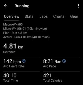 Actual: Run 4.81 km (40:10 mins)