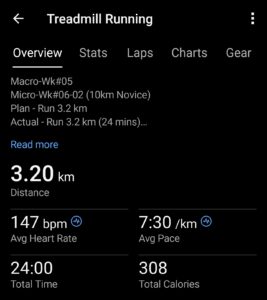Due to traveling for work mid-week, Miles had to re-adjust his training schedule. Not only that, he had to do his 3.2km run on a treadmill. Setting the speed at 8km/hr, it was still an easy run for Miles, though the HR was a bit higher than he had hoped.