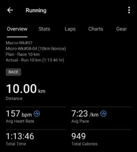 And so, their first phase of training has concluded. A 10km in a respectable 1:13:46 hr time, with an average pace of 7:23 mins/km.